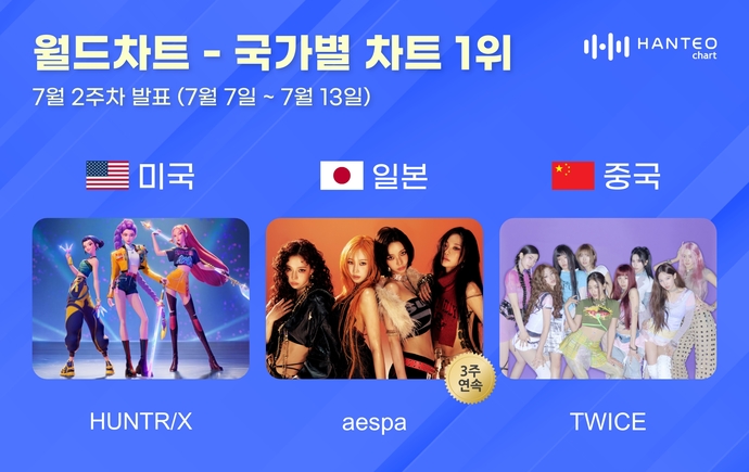 세계 유일 실시간 음악차트 한터차트는 18일 보도자료를 통해 7월 2주차(집계 기간 7월 7일~7월 13일) 미국, 일본, 중국 국가별 차트 TOP 30을 발표했다. 이에 따르면 헌트릭스(HUNTR/X)와 에스파(aespa), 트와이스(TWICE)가 각 부문 1위에 등극했다.