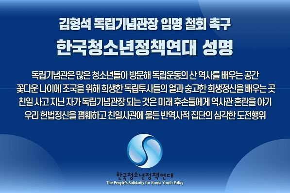 한국청소년정책연대(The People’s Solidarity for Korea Youth Policy;PSFKYP)는 성명에서 “독립기념관은 수많은 청소년들이 방문해 독립운동의 산 역사를 배우고 꽃다운 나이에 조국을 위해 희생한 독립투사들의 얼과 숭고한 희생정신을 배우는 중요한 장소”라며 “독립기념관 수장에 ‘일제 강점기가 한국 근대화에 도움이 됐다'고 주장하는 사람이 관장이 된다는 것은 미래 후손들에게 역사관 혼란을 야기함은 물론, 차마 부끄럽고 치욕스런 기막힌 일이 분명하다”고 비판했다.